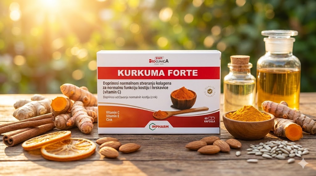 Kurkuma Forte kapsule sadrže suhi ekstrakt korijena kurkume (Curcuma Longa), vitamin E, vitamin C, Cink. 💊
